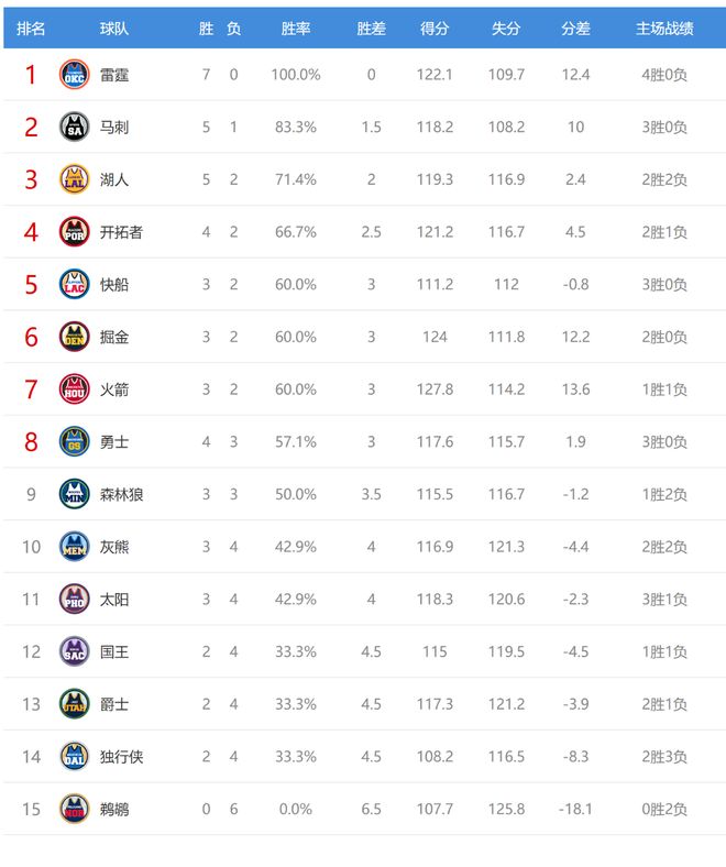 雷霆赢球后7胜0负继续开赛不败,战绩高居西部第一同时也是联盟第一。鹈鹕输球后0胜6负排名西部垫底。